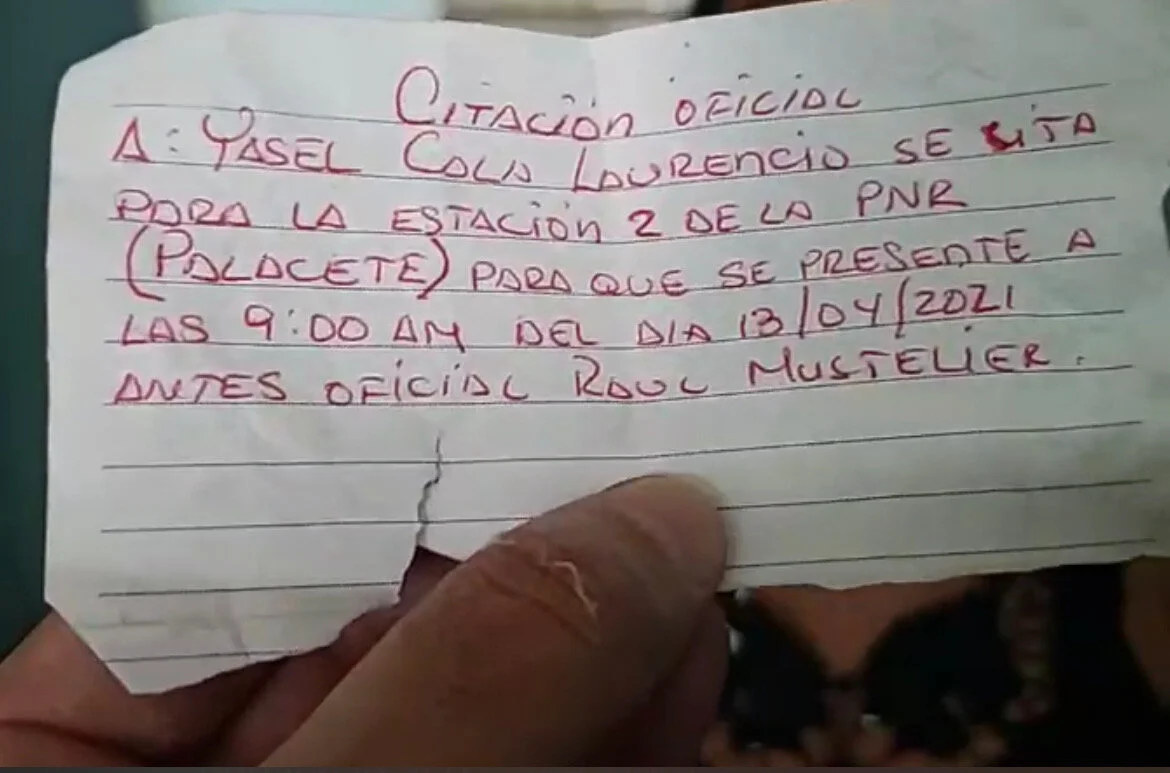 The example in the photos above shows how Yasel Cala Laurencio a human rights and pro democracy activist with the Patriotic Union of Cuba (UNPACU) in Santiago de Cuba was summoned by a State Security agent to appear in the Police Station known as El Palacete in the city of Santiago de Cuba to be interrogated by an officer by the name of Raúl Mustelier. However, when Yasel showed up at the police station on April 13, she was told by police that they have never heard of an officer by the name of Raúl Mustelier. It turned out they had no record of an officer by the name of Mustelier.
