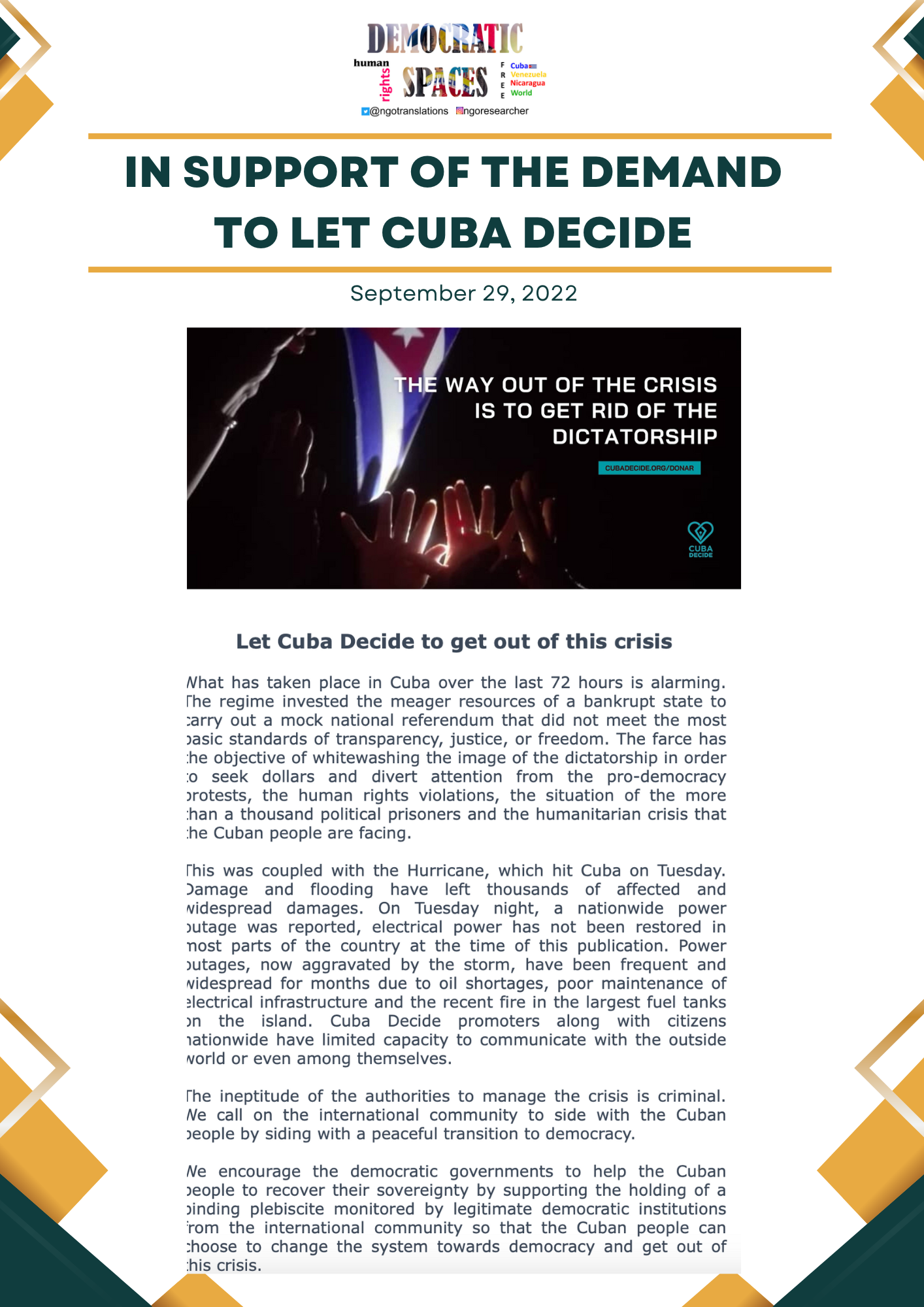 Amid a dictatorship in Cuba that whitewashing its image with a referendum that in the absence of independent institutions to verify its authenticity constitutes a farce and one that blocks freedoms needed to empower the people of Cuba in their handling of the humanitarian catastrophe the nation faces, we join the citizen initiative CUBADECIDE in its just and historic demand for a binding plebiscite monitored by legitimate democratic institutions.