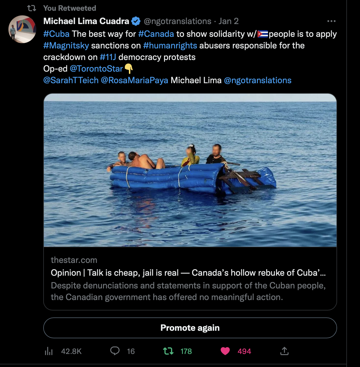 At the time Prime Minister Justin Trudeau was “deeply concerned by the violent crackdown on protests by the Cuban regime” and said “Cubans have the right to express themselves and to have their voices heard.” Canada’s Global Affairs Department tweeted that “Canada condemns [Cuba’s] harsh sentencing following the July 2021 protests” and that “[we] stand with the people of Cuba in their aspiration for democracy.”