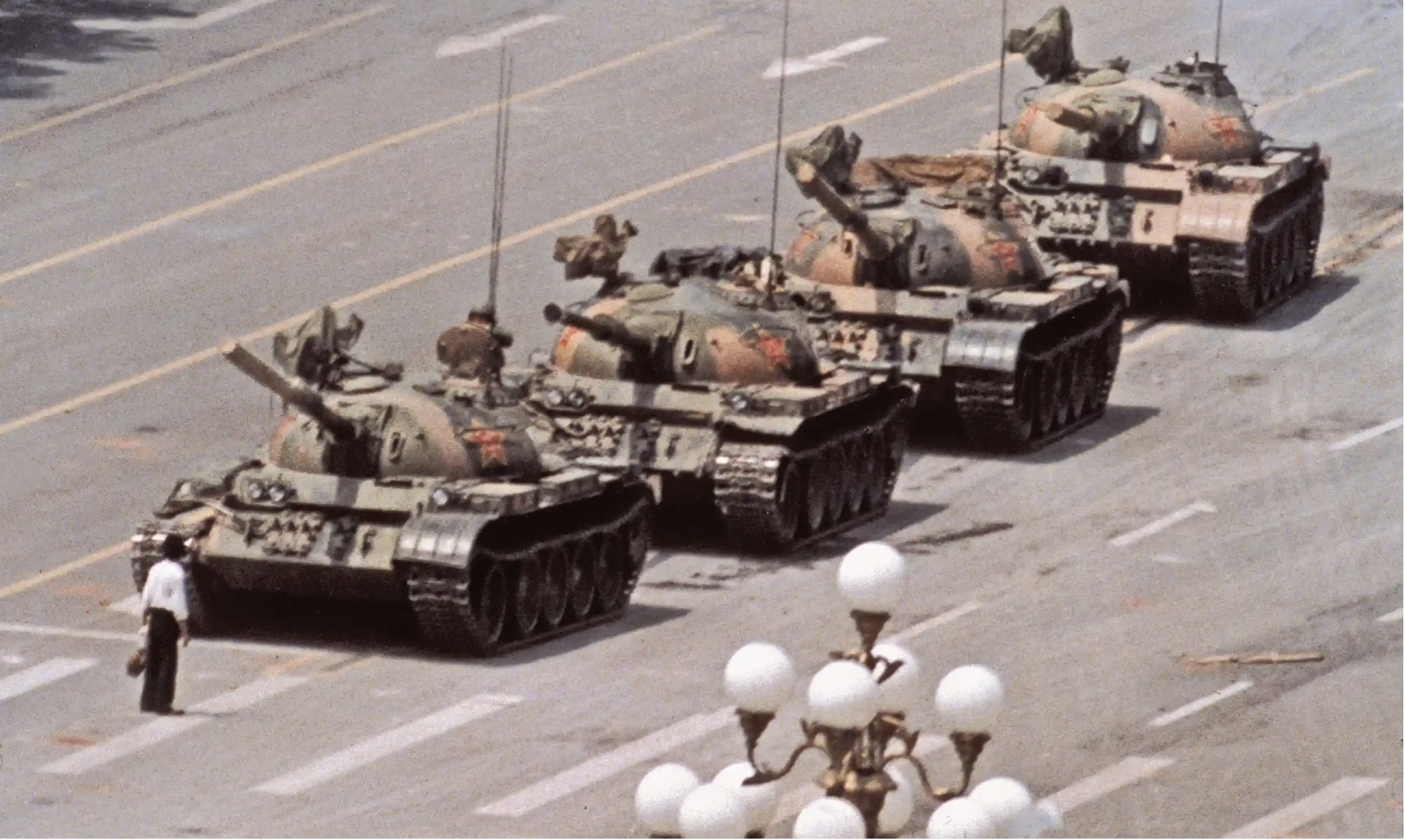 One of the most iconic photos of the 20th Century, “Tank Man.” A brave Chinese citizen stands in front of a tank column in Beijing on June 5, 1989. Photo taken by Jeff Widener. Tank Man stands as a global symbol of defiance and will power of the individual vs oppression.
