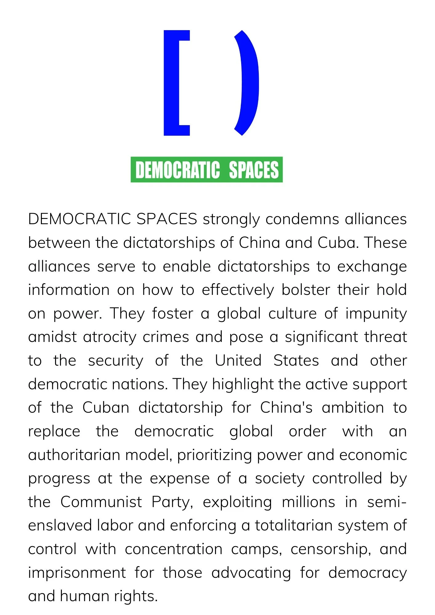 At Democratic Spaces, we condemn any alliance between the dictatorships of China and Cuba, as well as alliances with Russia and other dictatorial regimes globally. These alliances serve to enable dictatorships to exchange information on how to effectively bolster their hold on power. They pose an imminent threat to the security of the United States and other democracies. They also serve as a reminder that the Cuban dictatorship actively assists China in its aspirations to replace the democratic global order of the West with an authoritarian model that prioritizes maintaining power and purported economic progress at the expense of a society dominated by the Communist Party, based on the semi-enslaved labor of millions of people in the countryside and the establishment of a totalitarian Orwellian system of control, complete with concentration camps, censorship, and imprisonment for anyone who raises their voice for democracy and rights.