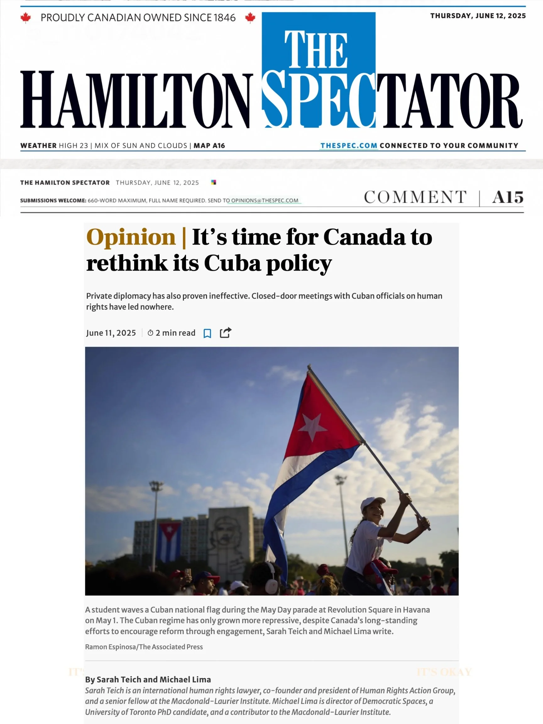 On June 12, 2025, The Hamilton Spectator published our op-ed titled 'It’s Time for Canada to Rethink Its Cuba Policy,' urging Prime Minister Mark Carney’s government to reassess its foreign policy toward the Cuban regime in light of its escalating repression in recent years and its authoritarian alliances with global adversaries such as Russia and China. We are calling on Canada to be consistent and to apply the same diplomatic, political, and legal tools it has used against other authoritarian regimes.